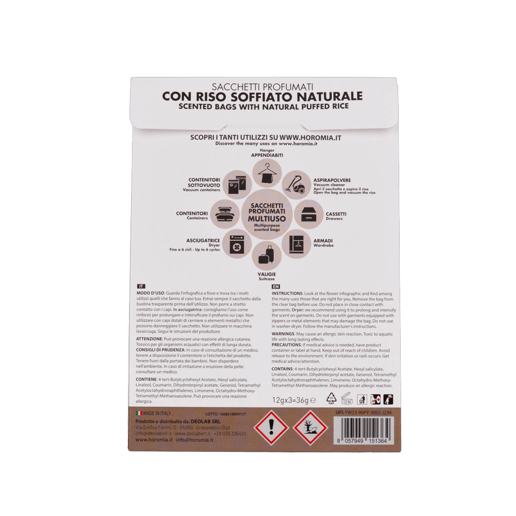 Edinstvene intenzivne dišave Horomia sedaj tudi v večnamenskih dišečih vrečkah. Dišeče vrečke so ustvarjene iz naravnega neživilskega napihnjenega riža in so oblikovane tako, da vašim oblačilom in vašemu domu dajejo edinstven in nepogrešljiv dišeč vonj. Vsako pakiranje vsebuje tri dišeče vrečke, katere so namenjene za večkratno uporabo. Dišeče vrečke se idealno uporabljajo v kombinaciji z istim vonjem parfuma za pranje perila, ki jih najdete v naši ponudbi.