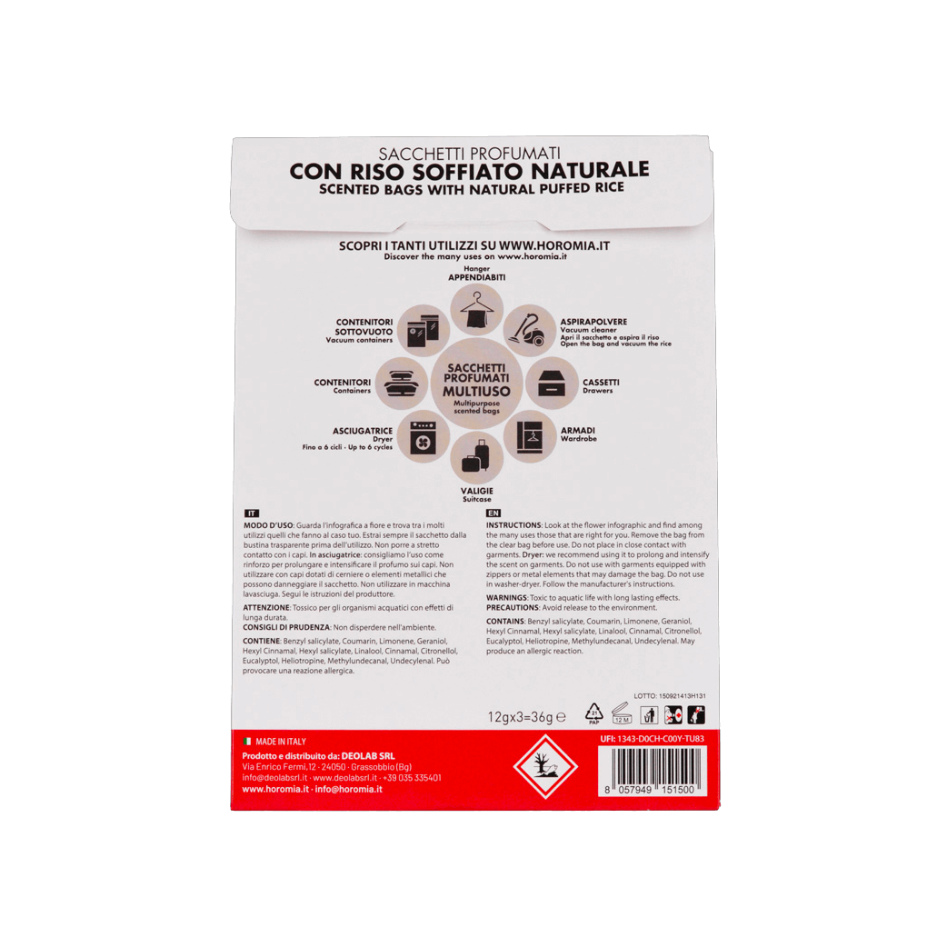 Edinstvene intenzivne dišave Horomia sedaj tudi v večnamenskih dišečih vrečkah. Dišeče vrečke so ustvarjene iz naravnega neživilskega napihnjenega riža in so oblikovane tako, da vašim oblačilom in vašemu domu dajejo edinstven in nepogrešljiv dišeč vonj. Vsako pakiranje vsebuje tri dišeče vrečke, katere so namenjene za večkratno uporabo. Dišeče vrečke se idealno uporabljajo v kombinaciji z istim vonjem parfuma za pranje perila, ki jih najdete v naši ponudbi.