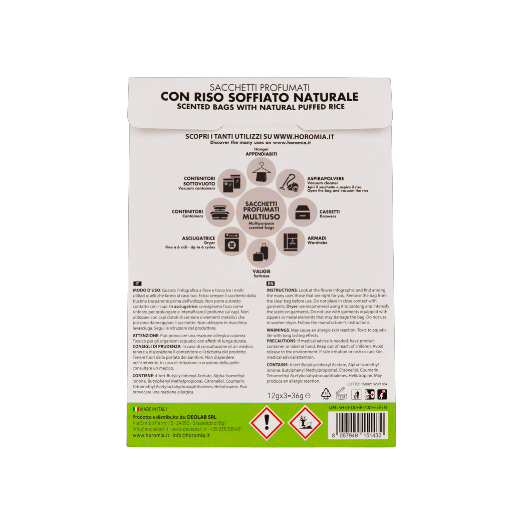 Edinstvene intenzivne dišave Horomia sedaj tudi v večnamenskih dišečih vrečkah. Dišeče vrečke so ustvarjene iz naravnega neživilskega napihnjenega riža in so oblikovane tako, da vašim oblačilom in vašemu domu dajejo edinstven in nepogrešljiv dišeč vonj. Vsako pakiranje vsebuje tri dišeče vrečke, katere so namenjene za večkratno uporabo. Dišeče vrečke se idealno uporabljajo v kombinaciji z istim vonjem parfuma za pranje perila, ki jih najdete v naši ponudbi.