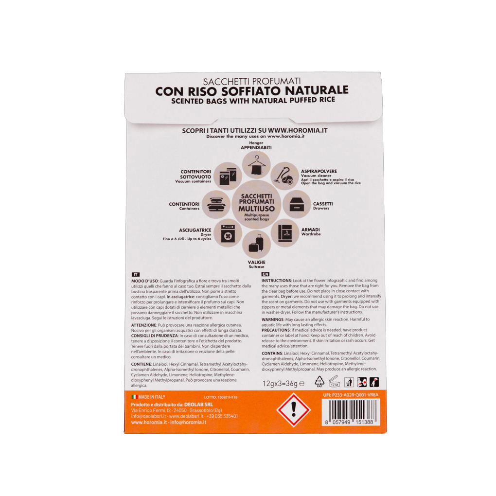 Edinstvene intenzivne dišave Horomia sedaj tudi v večnamenskih dišečih vrečkah. Dišeče vrečke so ustvarjene iz naravnega neživilskega napihnjenega riža in so oblikovane tako, da vašim oblačilom in vašemu domu dajejo edinstven in nepogrešljiv dišeč vonj. Vsako pakiranje vsebuje tri dišeče vrečke, katere so namenjene za večkratno uporabo. Dišeče vrečke se idealno uporabljajo v kombinaciji z istim vonjem parfuma za pranje perila, ki jih najdete v naši ponudbi.